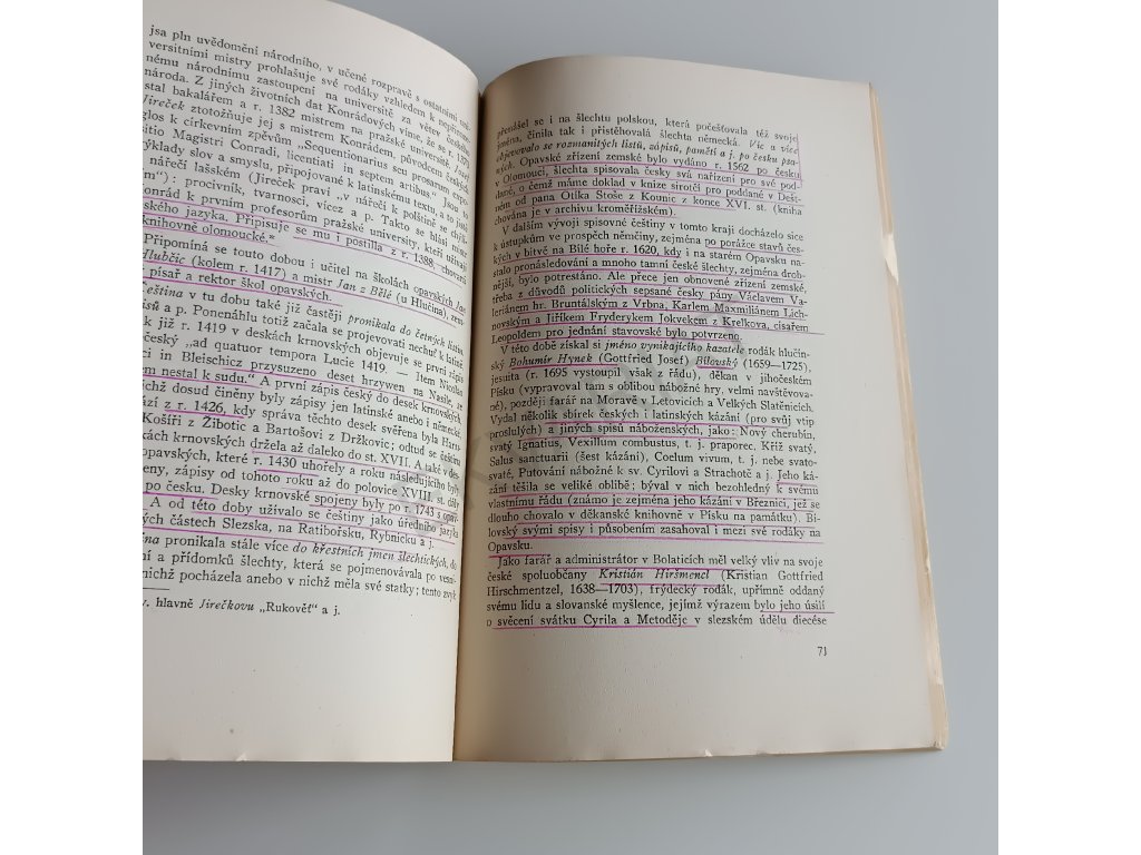 • Knižní blok: na několika stranách text podtržen pastelkou a skvrny od polití