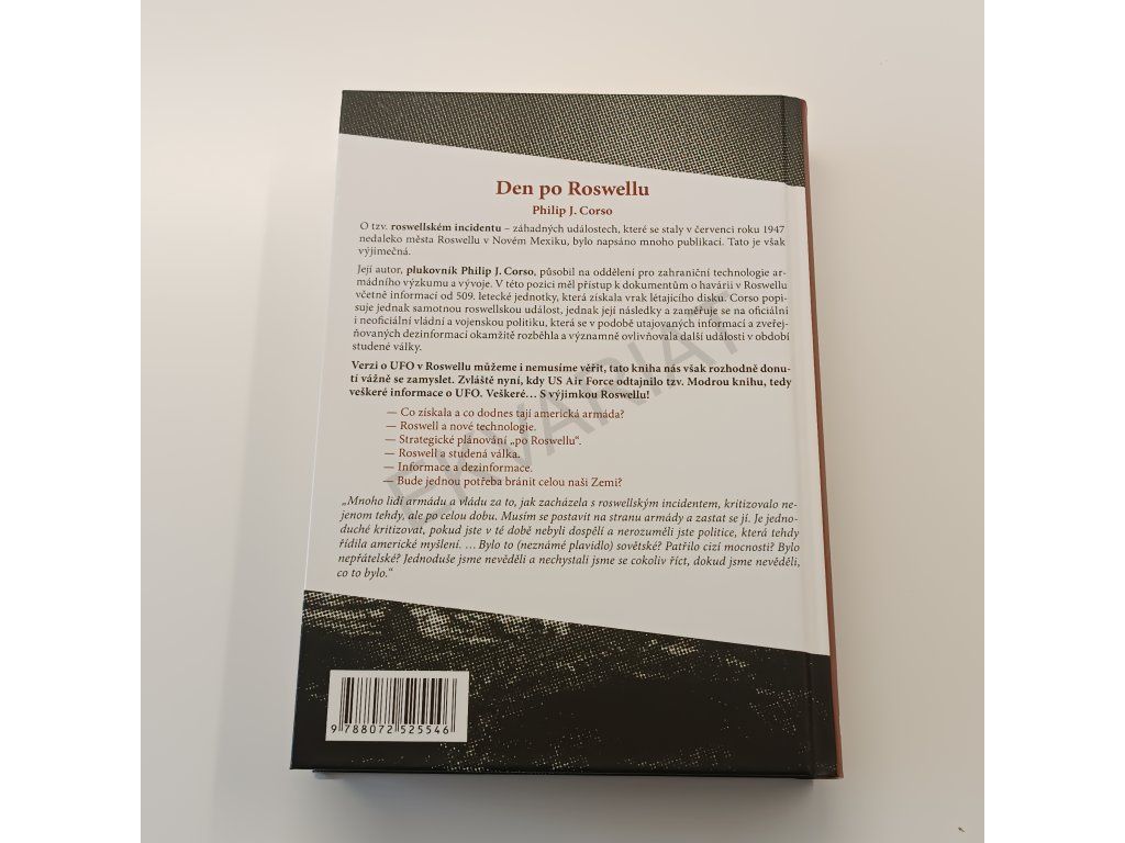O tzv. roswellském incidentu – záhadných událostech, které se staly v červenci roku 1947 nedaleko města Roswellu v Novém Mexiku, bylo napsáno mnoho publikací. Tato je však výjimečná. Její autor, plukovník Philip J. Corso, působil v Oddělení pro zahraniční technologie a armádního výzkumu a vývoje. V této pozici měl přístup k dokumentům o havárii v Roswellu včetně informací od 509. letecké jednotky, která získala vrak létajícího disku. Corso popisuje jednak samotnou roswellskou událost, jednak její následky a zaměřuje se na oficiální i neoficiální vládní a vojenskou politiku, která se v podobě utajovaných informací a zveřejňovaných dezinformací okamžitě rozběhla a významně ovlivňovala další události v období studené války. Verzi o UFO v Roswellu můžeme i nemusíme věřit...