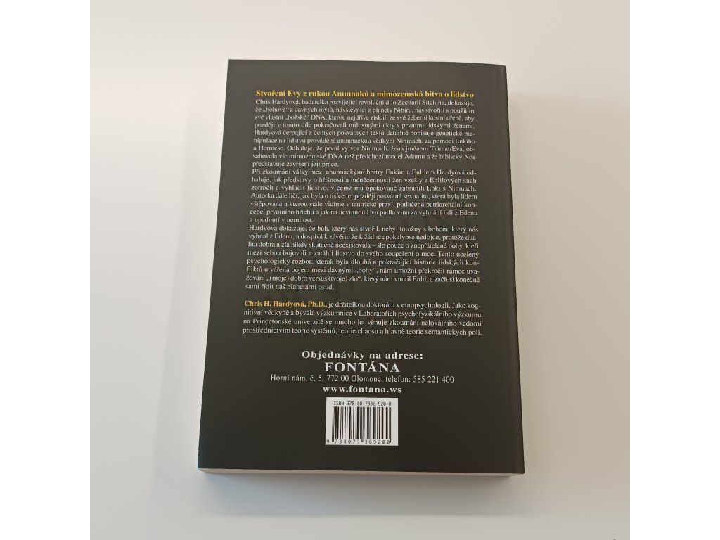 Chris Hardyová, badatelka rozvíjející revoluční dílo Zecharii Sitchina, dokazuje, že „bohové" z dávných mýtů, návštěvníci z planety Nibiru, nás stvořili s použitím své vlastní „božské" DNA, kterou nejdříve získali ze své žeberní kostní dřeně, aby později v tomto díle pokračovali milostnými akty s prvními lidskými ženami. Hardyová čerpající z četných posvátných textů detailně popisuje genetické manipulace na lidstvu prováděné anunnackou vědkyní Ninmach, za pomoci Enkiho a Hermese. Odhaluje, že první výtvor Ninmach, žena jménem Tiámat/Eva, obsahovala víc mimozemské DNA než předchozí model Adamu a že biblický Noe představuje završení její práce. Při zkoumání války mezi anunnackými bratry Enkim a Enlilem Hardyová odhaluje, jak představy o hříšnosti a méněcennosti žen vzešly z Enlilových snah zotročit a vyhladit lidstvo, v čemž mu opakovaně zabránili Enki s Ninmach. Autorka dále líčí, jak byla o tisíce let později posvátná sexualita, která byla lidem vštěpovaná a kterou stále vidíme v tantrické praxi, potlačena patriarchální koncepcí prvotního hříchu a jak na nevinnou Evu padla vina za vyhnání lidí z Edenu a upadnutí v nemilost. Hardyová dokazuje, že bůh, který nás stvořil, nebyl totožný s bohem, který nás vyhnal z Edenu, a dospívá k závěru, že k žádné apokalypse nedojde, protože dualita dobra a zla nikdy skutečně neexistovala — šlo pouze o znepřátelené bohy, kteří mezi sebou bojovali a zatáhli lidstvo do svého soupeření o moc. Tento ucelený psychologický rozbor, kterak byla dlouhá a pokračující historie lidských konfliktů utvářena bojem mezi dávnými „bohy", nám umožní překročit rámec uvažování „(moje) dobro versus (tvoje) zlo", který nám vnutil Enlil, a začít si konečně sami řídit náš planetární osud. Chris H. Hardyová, Ph.D., je držitelkou doktorátu v etnopsychologii. Jako kognitivní vědkyně a bývalá výzkumnice v Laboratořích psychofyzikálního výzkumu na Princetonské univerzitě se mnoho let věnuje zkoumání nelokálního vědomí prostřednictvím teorie systémů, teorie chaosu a hlavně teorie sémantických polí
