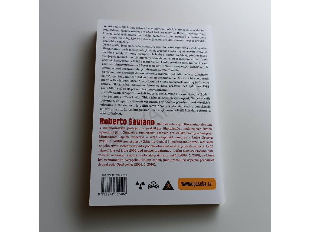 Světoznámý italský novinář se ve své nejnovější knize vrací k řadě palčivých problémů italské společnosti, které jsou v centru jeho pozornosti již od doby, kdy ve své nejslavnější knize Gomora strhujícím způsobem popsal praktiky neapolské mafie. Nová znepokojivá zjištění předkládá zejména v oblasti pronikání mafiánských struktur z jihu na sever Itálie, znovu bilancuje akutní problém nezákonné likvidace toxických odpadů, působivě líčí boj kalábrijského kněze o vytvoření centra pro postižené v domě zabaveném mafii, která jej však odmítá předat novým vlastníkům. Tak jako v minulosti, i v nové knize zaujme Saviano svým otevřeným, naléhavým a přitom čtivým stylem a zejména v úvahách věnovaných všudypřítomné korupci, neupřímnosti předvolebních slibů politiků či manipulovatelnosti médií má rozhodně co říci i čtenářům daleko za italskými hranicemi.